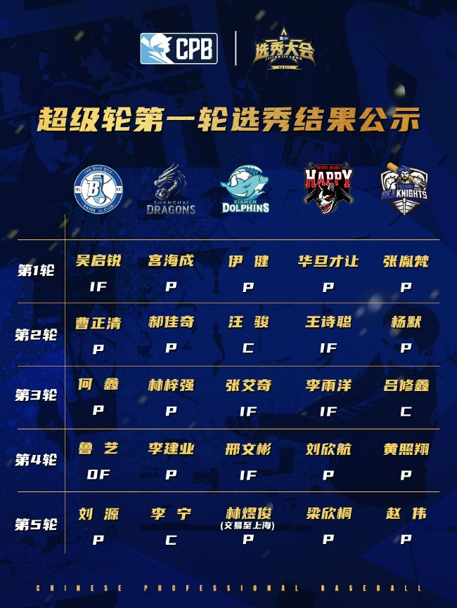 11月26日,CPB中国棒球城市联赛第一届选秀大会在深圳告捷举行,五支球队在超等轮中挑选了25位球员,天禀轮中有32位球员中选,盘算57位球员在本次选秀大会中被满意俱乐部选中,后续将插足洽道、签约顺序。