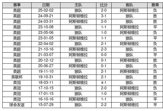 阿斯顿维拉 VS 狼队两队近10年的交战次数为18场,阿斯顿维拉5胜5平8负,赢球概率为27.8%,平局概率为27.8%,输球概率为44.4%。
