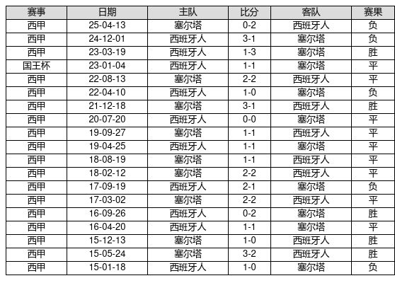 塞尔塔 VS 西班经纪东谈主两队近10年的交战次数为19场,塞尔塔5胜9平5负,赢球概率为26.3%,平局概率为47.4%,输球概率为26.3%。