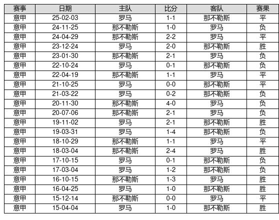 罗马 VS 那不勒斯两队近10年的交战次数为21场,罗马6胜6平9负,赢球概率为28.6%,平局概率为28.6%,输球概率为42.9%。