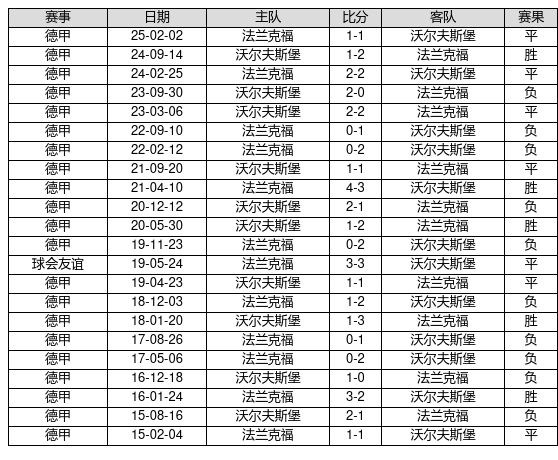 法兰克福 VS 沃尔夫斯堡两队近10年的交战次数为22场,法兰克福5胜7平10负,赢球概率为22.7%,平局概率为31.8%,输球概率为45.5%。
