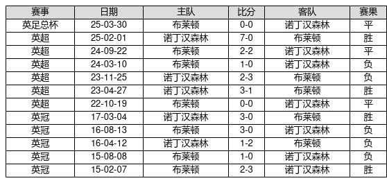 诺丁汉丛林 VS 布莱顿两队近10年的交战次数为12场,诺丁汉丛林4胜3平5负,赢球概率为33.3%,平局概率为25.0%,输球概率为41.7%。