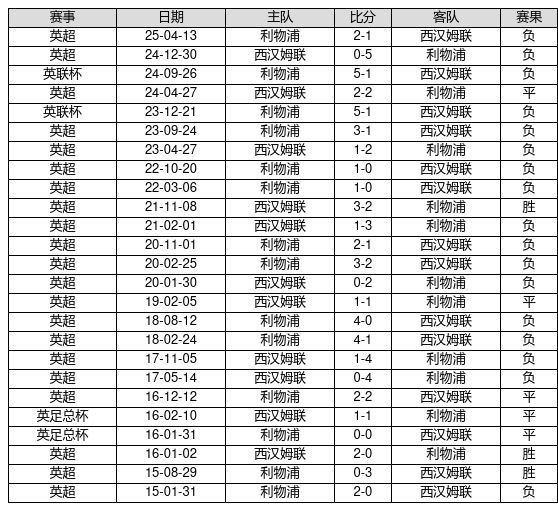 西汉姆联 VS 利物浦两队近10年的交战次数为25场,西汉姆联3胜5平17负,赢球概率为12.0%,平局概率为20.0%,输球概率为68.0%。