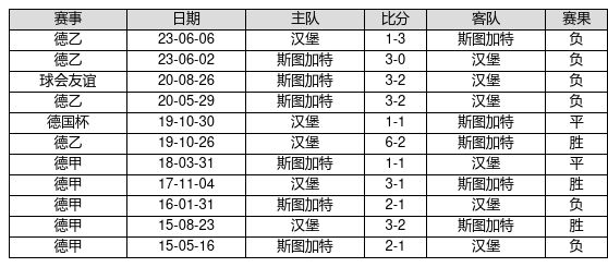汉堡 VS 斯图加特两队近10年的交战次数为11场,汉堡3胜2平6负,赢球概率为27.3%,平局概率为18.2%,输球概率为54.5%。