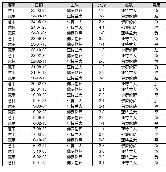 亚特兰大 VS 佛罗伦萨两队近10年的交战次数为28场,亚特兰大8胜7平13负,赢球概率为28.6%,平局概率为25.0%,输球概率为46.4%。