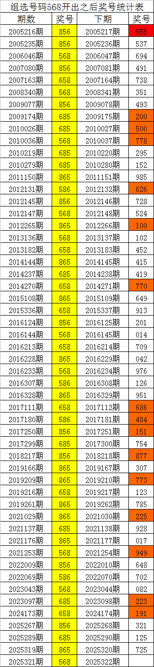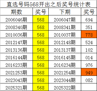 从上表统计不错看出,直选号码568开出之后,其下期奖号: