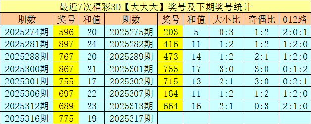 一、福彩3D上期奖号为775,大小类型开出:大大大,历史上该大小类型奖号共出现1095次,最近7次【大大大】奖号别离开出:596、897、767、867、755、697、689,其中组三号码出现2次,组六号码出现5次。