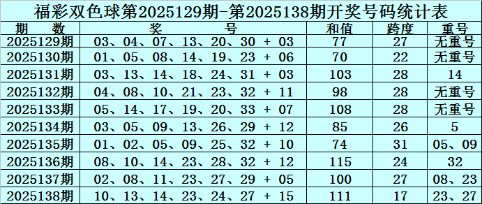 双色球第2025138期奖号开出:10、13、14、23、24、27 + 15,红球号码和值开出111,跨度开出17,开出重号2个:23、27。蓝球为0路号码。