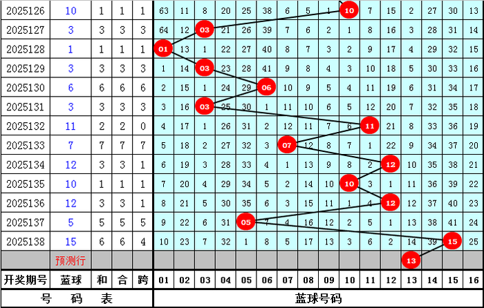蓝球分析:上期开出蓝球号码15,蓝球遗漏值为35,温冷蓝球近期开出比例较高,本期防冷码蓝球链接解冻,参考蓝球号码13。